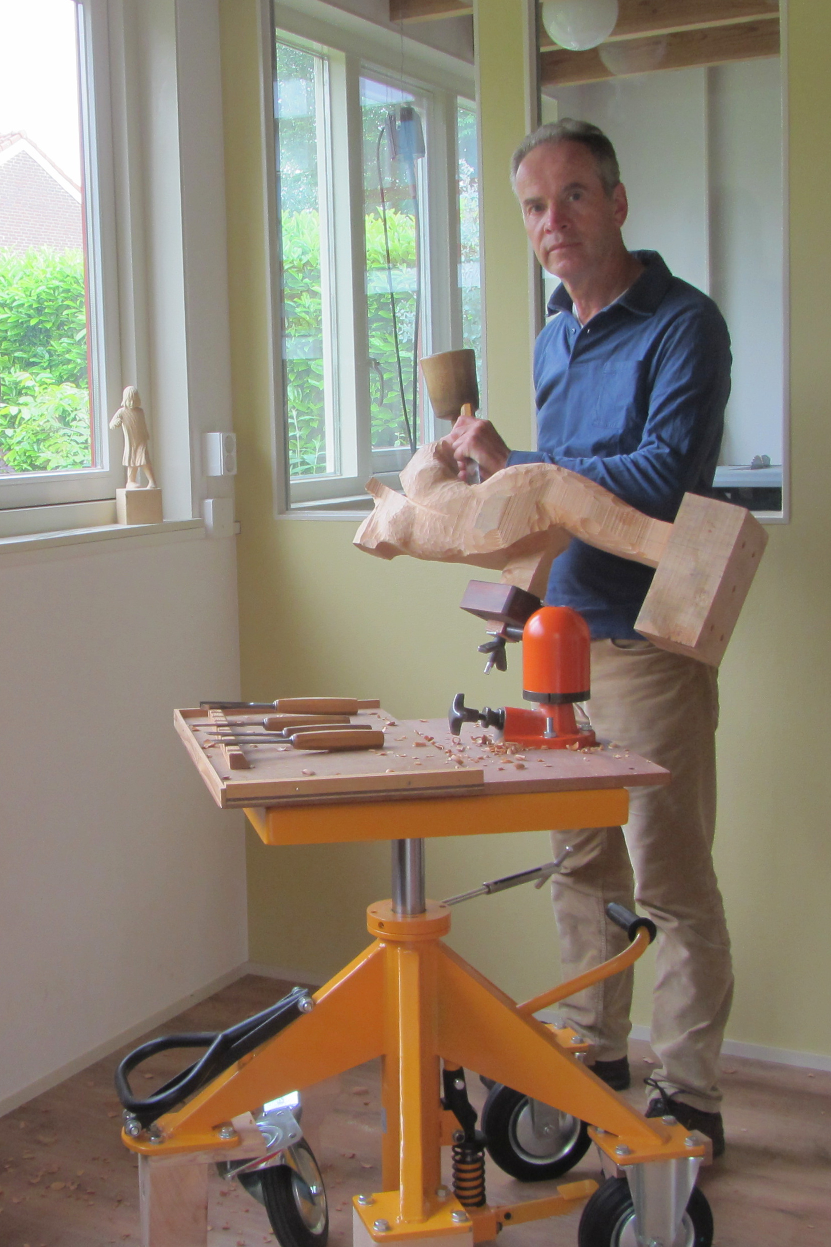 Het zoeken en vrijmaken van de vorm in hout is een boeiend proces, van idee tot ontwerp en van grof hakwerk naar gedetaileerd snijwerk, waarbij ik in vele rondes naar het einddoel toewerk. Daarbij werk ik het grootste deel van de tijd handmatig en met veel verschillende gutsen.