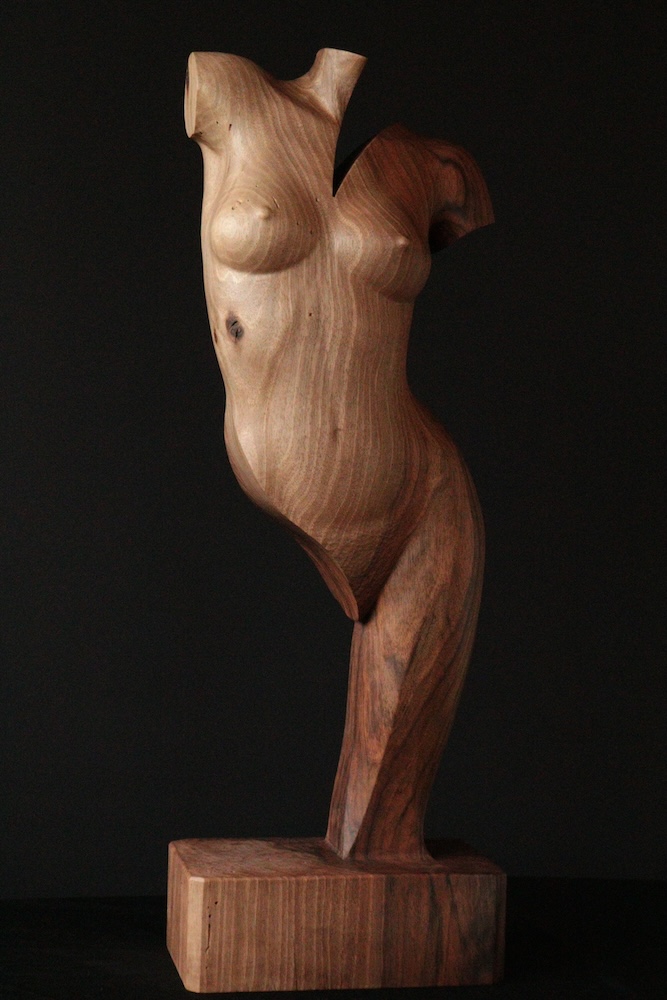 Gestileerde vrouwelijke tors gesneden in notenhout. Het notenhout is de meest luxe Nederlandse houtsoort en heeft van nature een prachtig kleur en structuur.